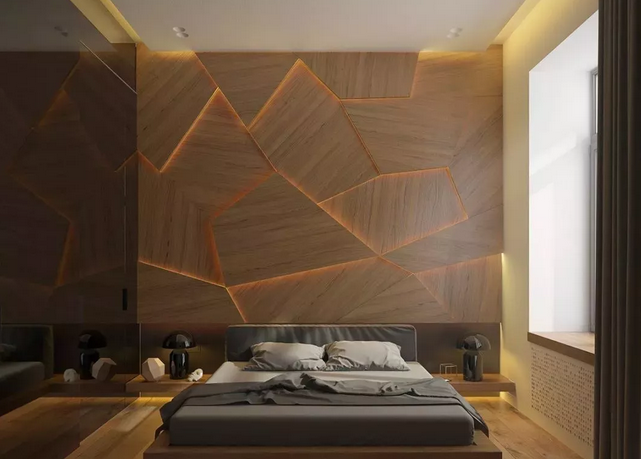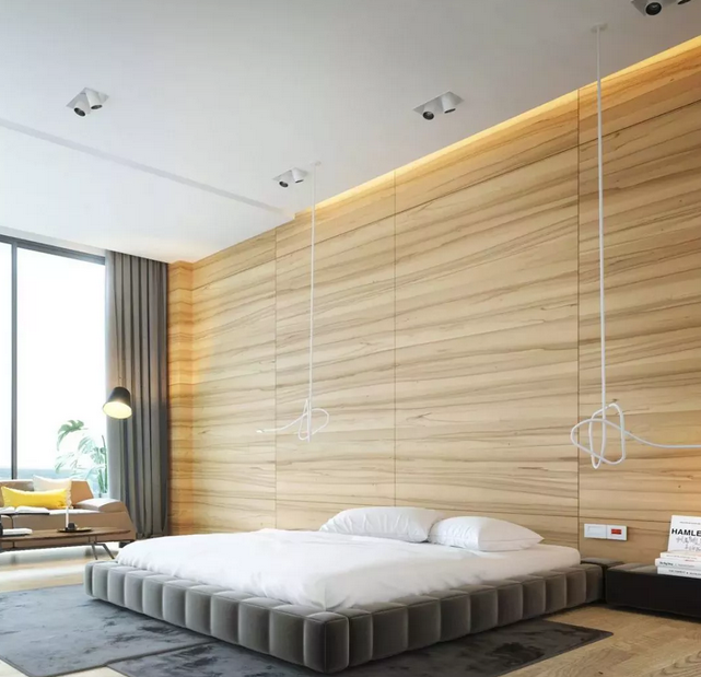 近年來北歐、日式風(fēng)格逐漸盛行,原木也開始成為設(shè)計(jì)上的主打材質(zhì), 用木飾面代替相框、裝飾畫來進(jìn)行臥室裝扮,新意十足。