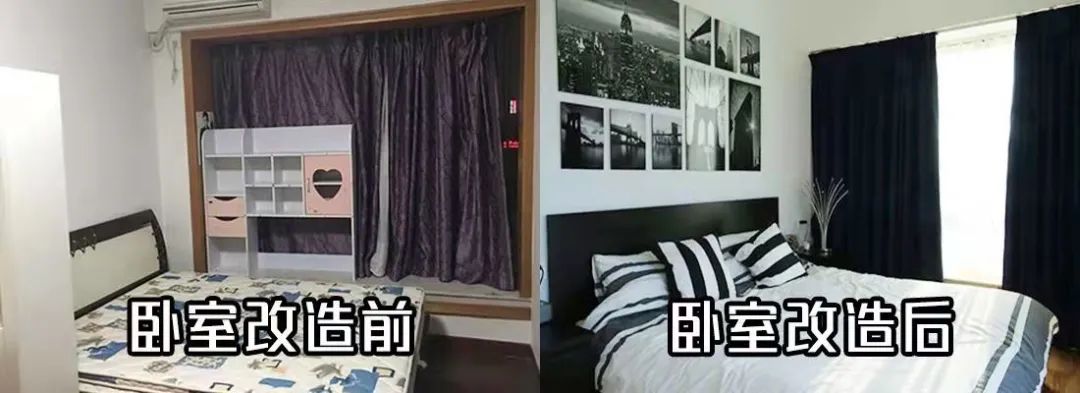 經(jīng)過(guò)改造后,擴(kuò)大了臥室的空間,兩邊都有床頭柜,窗簾前置,設(shè)在飄窗里面,能夠完全遮擋住墻邊。地板換成淺木紋地板,奠定了輕松舒適的氛圍。