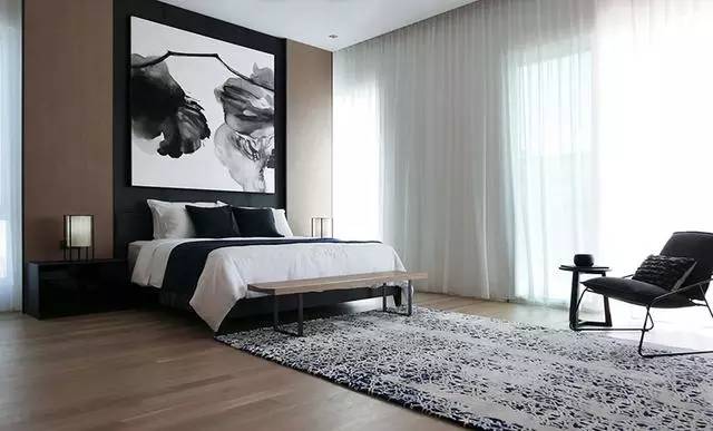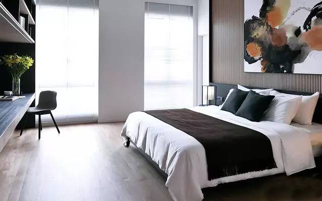 ▲床頭背景墻也被設(shè)計成木質(zhì)的,搭配衣服黑白的水墨畫后,別有一番意境。