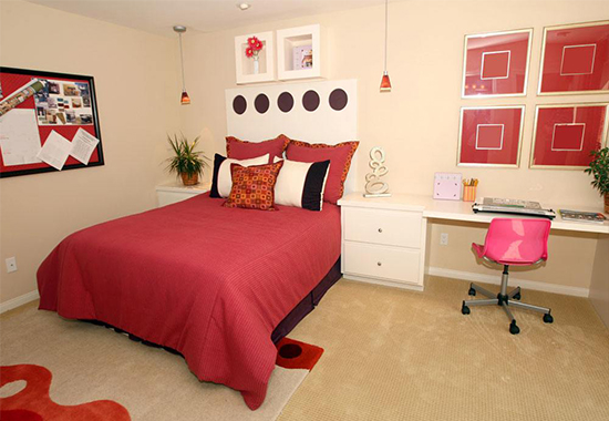 中國(guó)人認(rèn)為紅色是吉祥色,新婚的喜房就都是滿眼紅彤彤的。紅色還具有熱情、奔放的含義,充滿燃燒的力量。但居室內(nèi)紅色過(guò)多會(huì)讓眼睛負(fù)擔(dān)過(guò)重,產(chǎn)生頭暈?zāi)垦5母杏X(jué),即使是新婚,也不能長(zhǎng)時(shí)間讓房間處于紅色的主調(diào)下。建議選擇紅色在軟裝飾上使用,比如窗簾、床品、靠包等,而用淡淡的米色或清新的白色搭配,可以使人神清氣爽,更能突出紅色的喜慶氣氛。