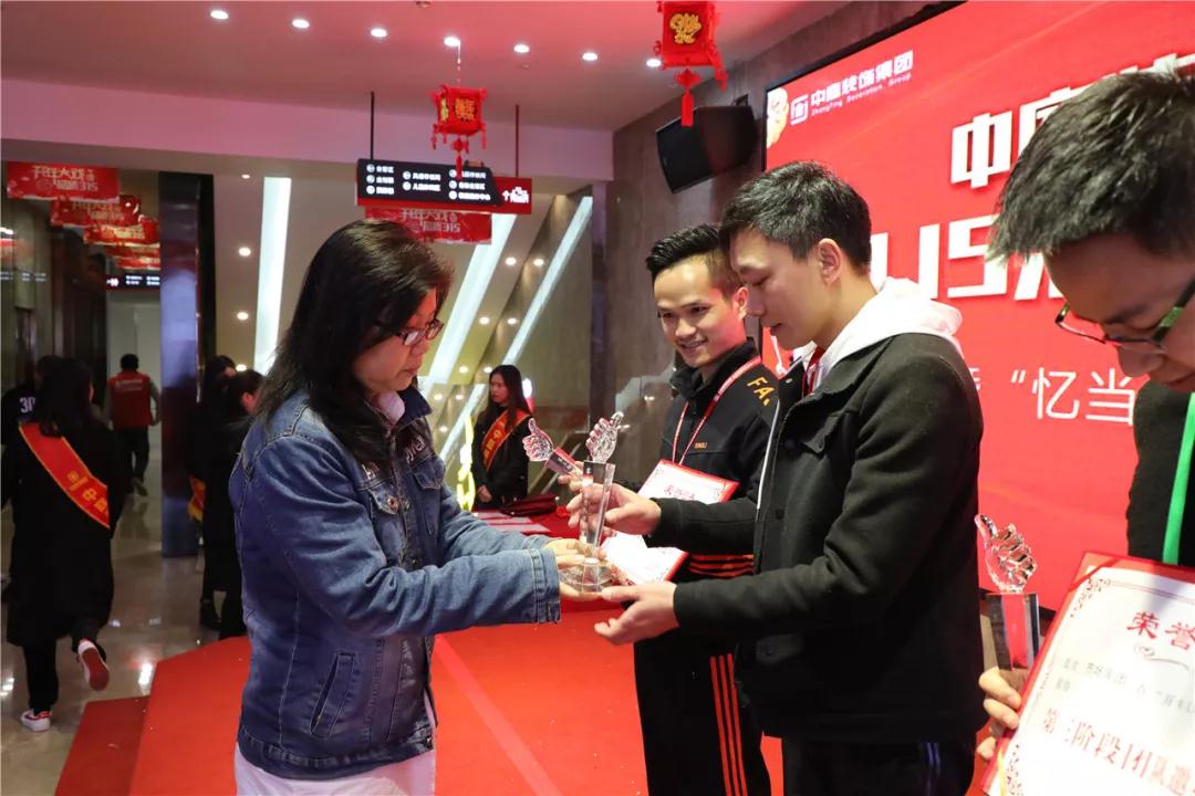 集團(tuán)商學(xué)院院長趙立鳳為獲獎(jiǎng)團(tuán)隊(duì)頒發(fā)榮譽(yù)證書和獎(jiǎng)杯