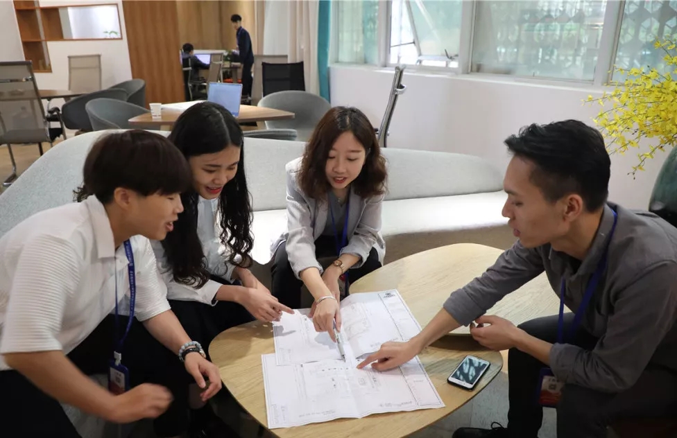 (林工和團隊討論設(shè)計方案)