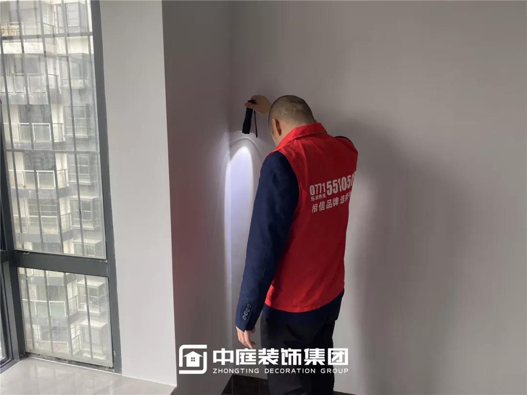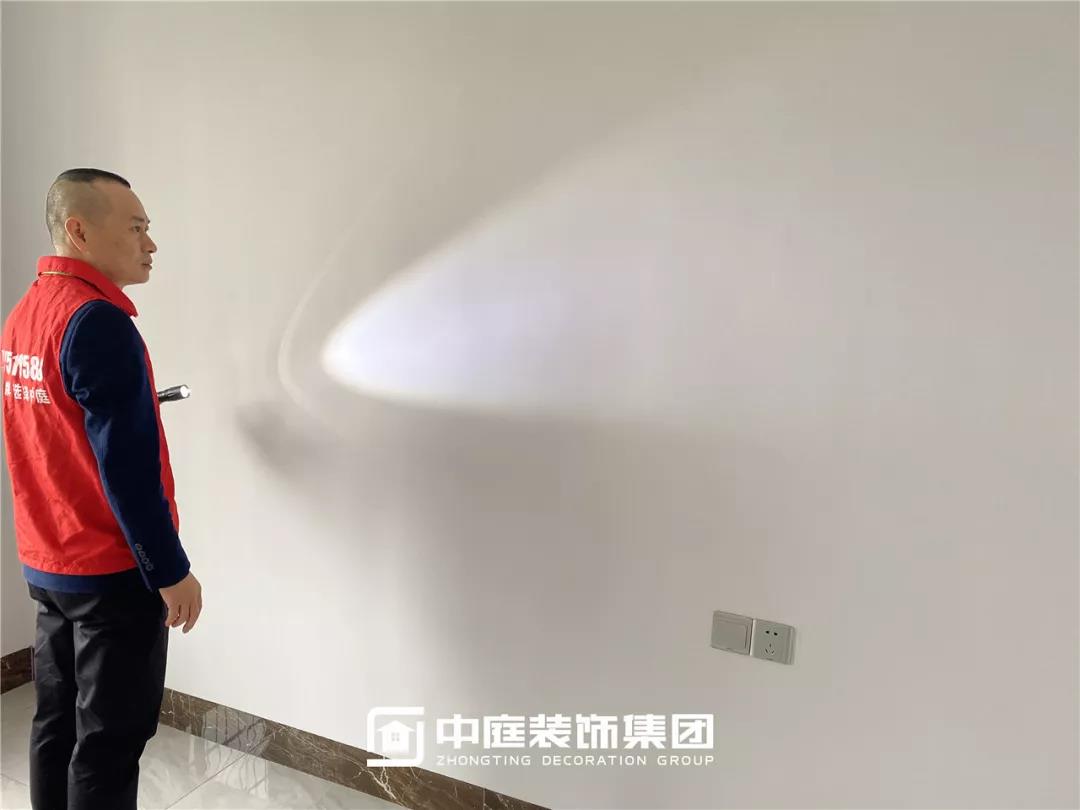 使用強光手電檢查墻面、陰角膩子施工打磨情況,施工是否達標。