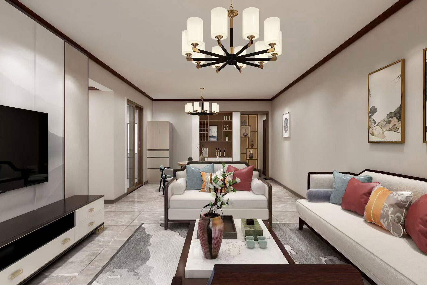 本案例總面積為148㎡,整體屬于新中式風(fēng)格,室內(nèi)空間講究主次分明、追求合理的空間布局和家具擺設(shè)。同時(shí)非常強(qiáng)調(diào)融入自然,并且注重人與空間的關(guān)系。提取傳統(tǒng)家居的精華元素和生活符號(hào)進(jìn)行合理的搭配、布局,使整體的家居設(shè)計(jì)中既有中式家居的傳統(tǒng)韻味,又能夠讓傳統(tǒng)元素更具筒練、大氣、時(shí)尚的特點(diǎn)。