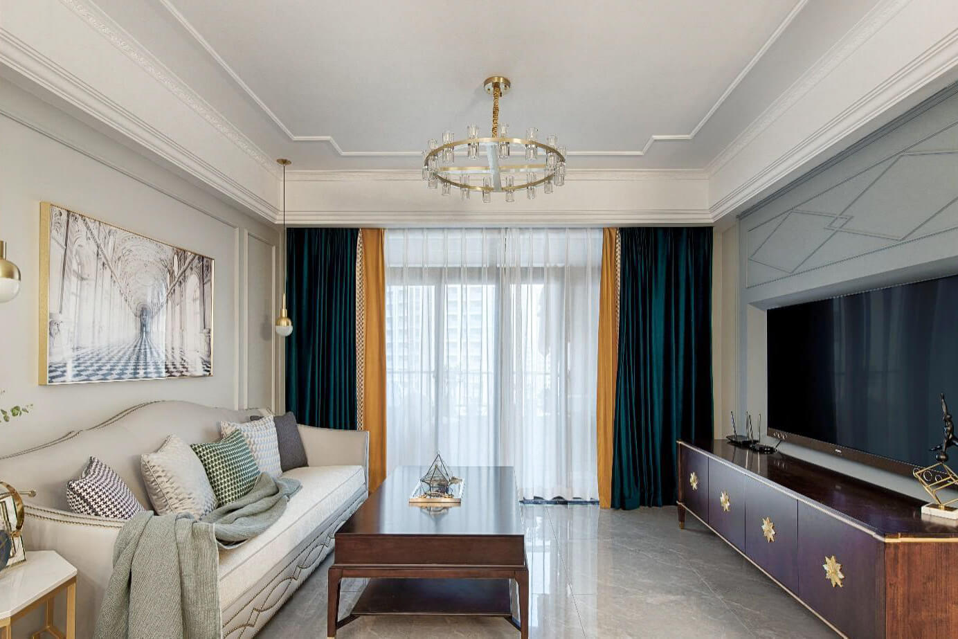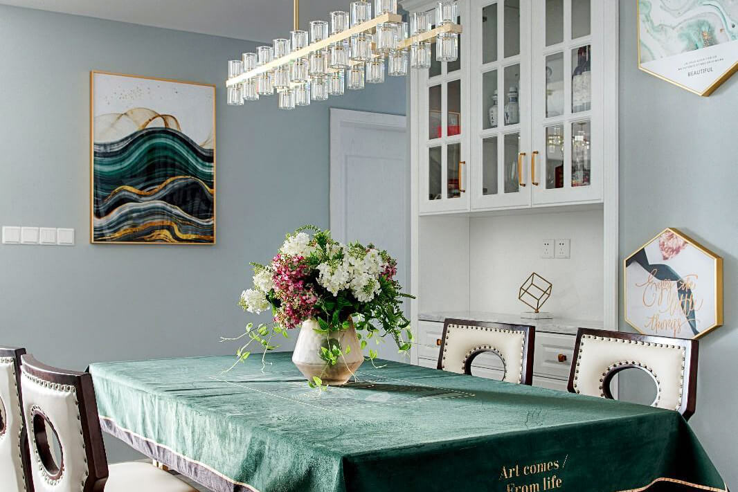 本案總面積90㎡,是簡(jiǎn)潔精致的現(xiàn)代美式風(fēng),一改傳統(tǒng)美式厚重的色調(diào),以灰白色調(diào)為主,以明艷色彩點(diǎn)綴為輔,打造了一個(gè)清新的舒適居住空間。局部用線條與金屬質(zhì)感的軟裝點(diǎn)綴空間,給予空間品質(zhì),加上沙發(fā)的柔軟布藝材質(zhì),又豐富了空間的柔美性,材質(zhì)與顏色的完美融合使空間散發(fā)靜謐與優(yōu)雅的氣息。