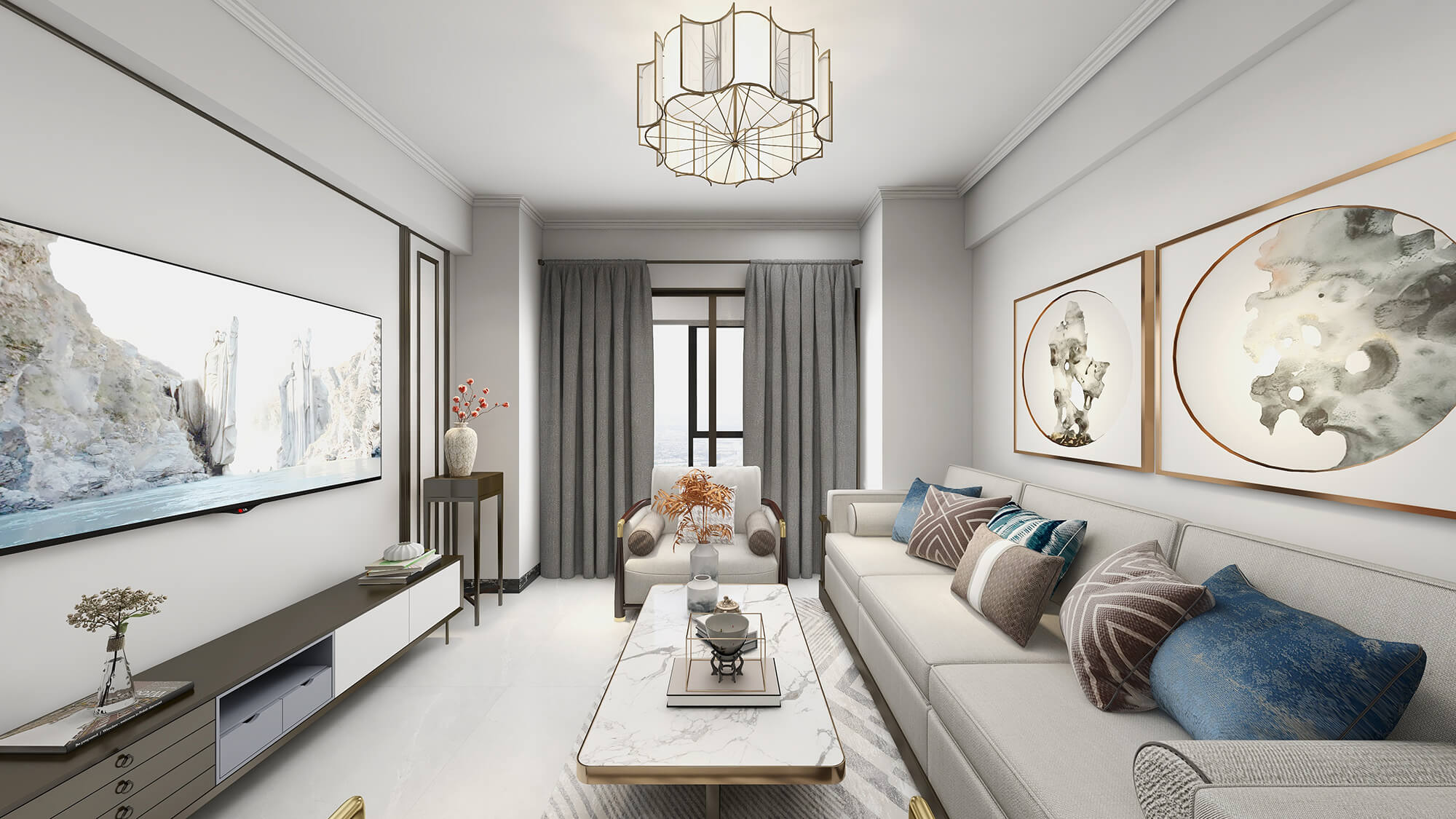 瀏覽量:568本案戶型為:3房2廳2衛(wèi),總面積72㎡。本案風(fēng)格為新中式,在空間中以淺灰色為主色調(diào),將中式元素以生活的面目表達(dá)出來。在造型、擺件等上面采用一些中式手法,為空間增添高雅秀逸的意境美,使得整體空間賞心悅目,并充滿韻味。