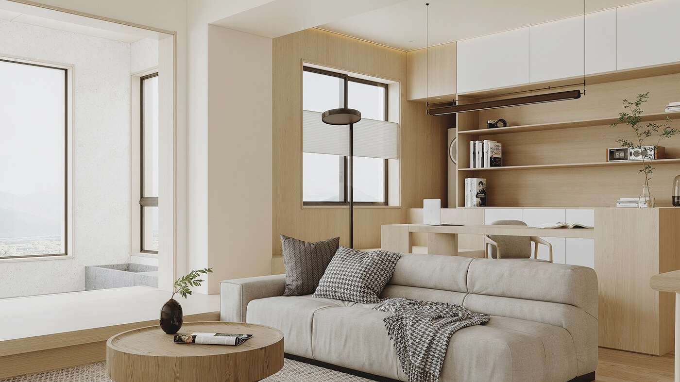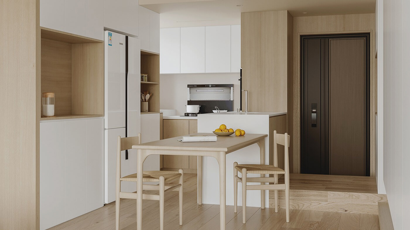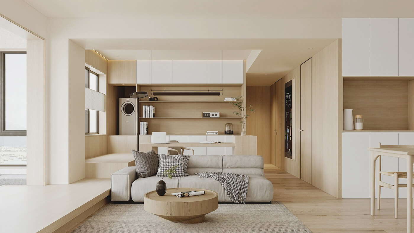 該案例采用木質(zhì)元素,整體呈現(xiàn)簡約效果,空間上將空間極大化利用的設計。日式家居中多采用沉靜溫和的自然色彩,家具的造型線條簡潔,大氣又自然。