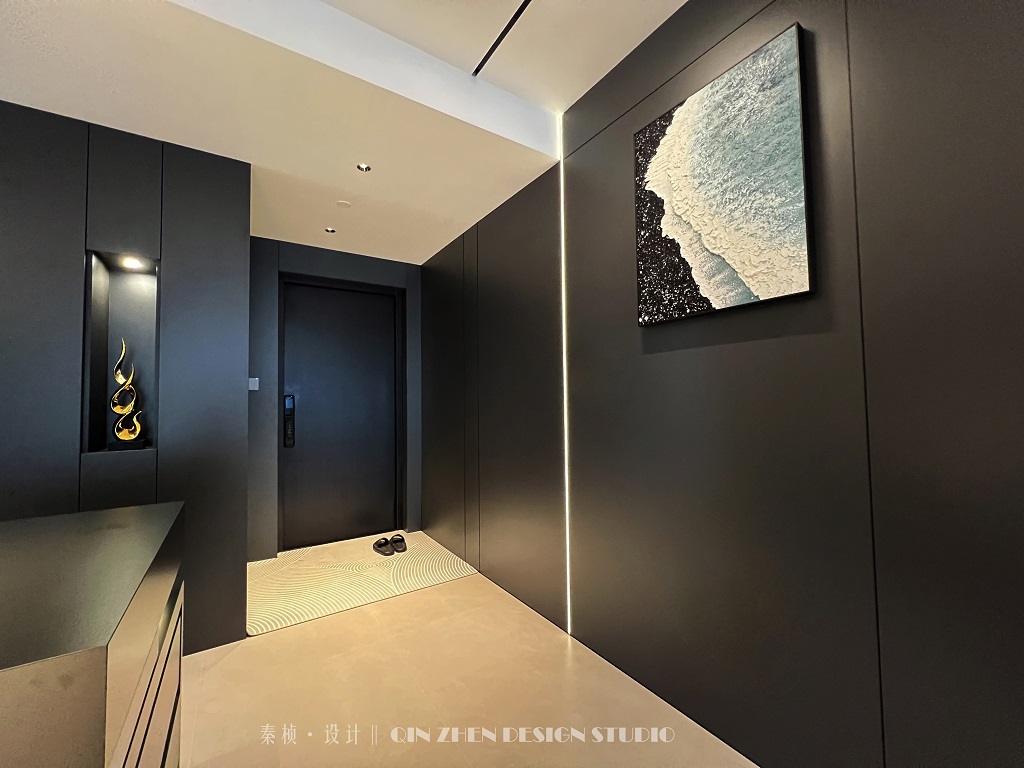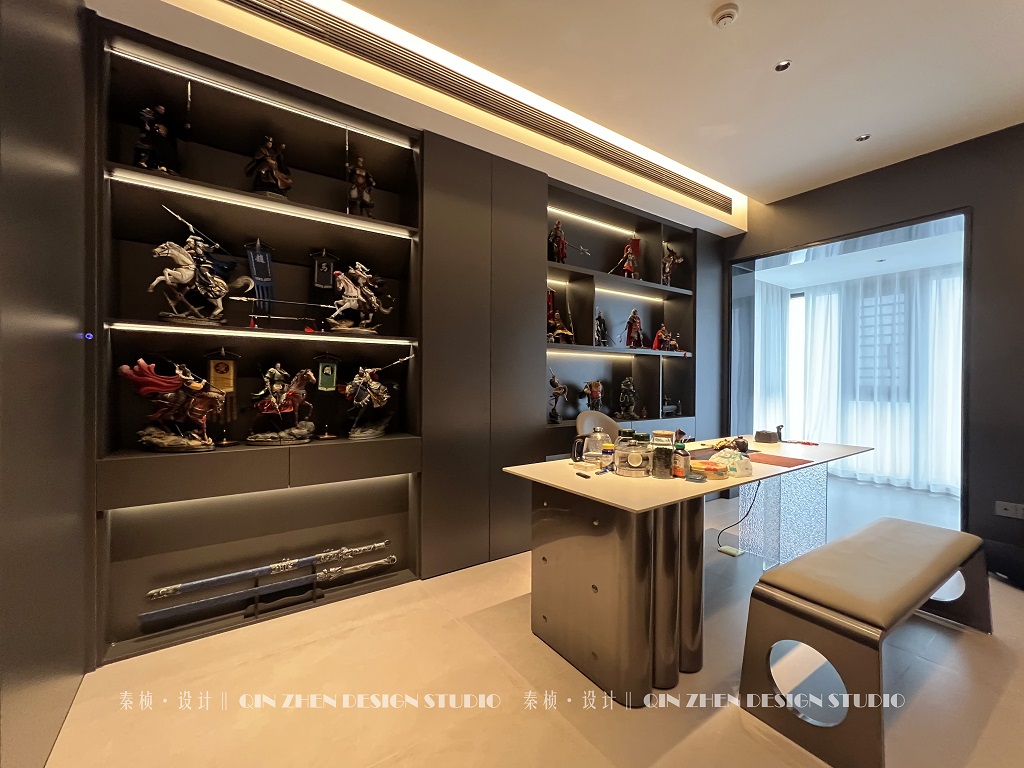 戶型改造: ◆原戶型的5房直接改成2房,入戶封閉廚房拆除; ◆將原有的老人房拆除做成半開(kāi)放式書房+茶室; ◆把次臥做隱藏門隱秘空間、打通陽(yáng)臺(tái); ◆原有的封閉式廚房做成開(kāi)放式廚房; ◆靠近主臥的次臥打通,做成衣帽間;
