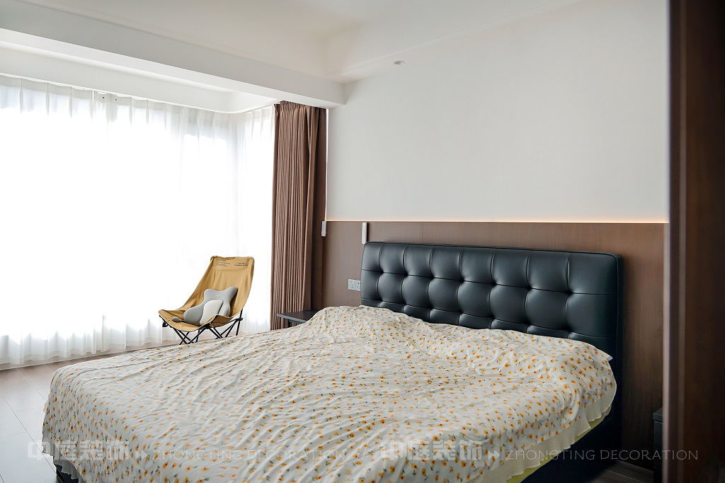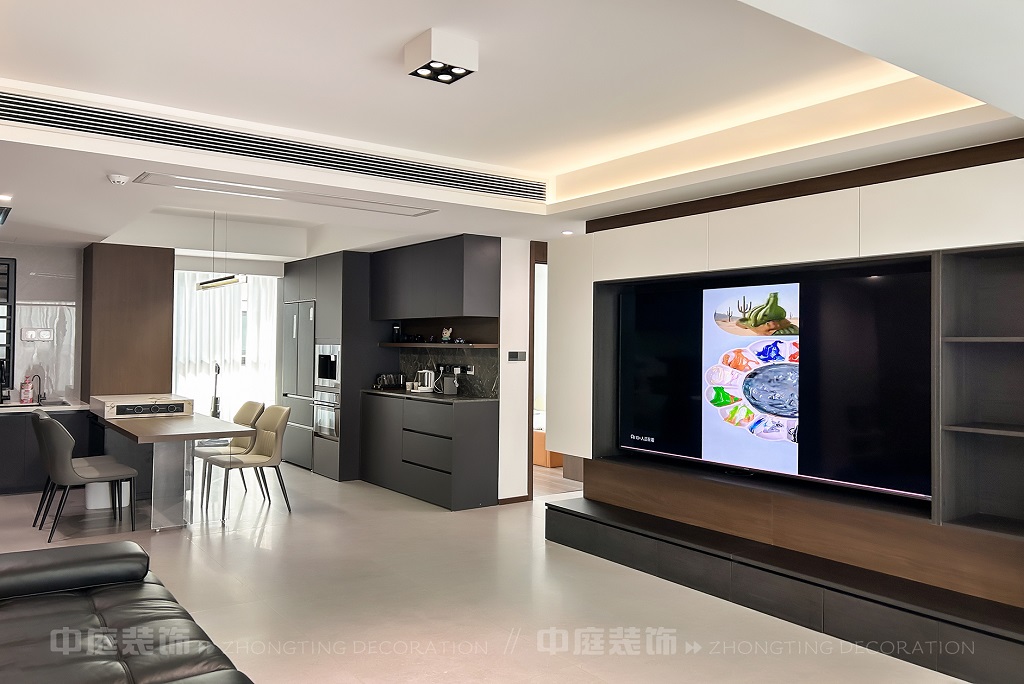 客廳以現(xiàn)代黑白灰極簡風格為核心,大面積白紗簾引入自然光線,黑色皮質(zhì)沙發(fā)質(zhì)感高級。開放式布局,深灰櫥柜與木質(zhì)餐桌形成材質(zhì)對比,線性吊燈提升精致感,功能與美學兼具,營造現(xiàn)代簡約的烹飪用餐氛圍。輕柔窗簾與柔和燈光,打造靜謐休息空間。精致的材質(zhì)選擇與合理的功能規(guī)劃,詮釋了“少即是多”的現(xiàn)代簡約居住美學。