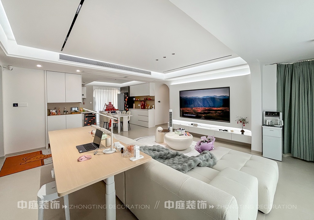 這套房子的裝修風(fēng)格屬于現(xiàn)代奶油風(fēng)格。整體以純凈的白色為主色調(diào),營(yíng)造出簡(jiǎn)潔明亮的空間感。線條設(shè)計(jì)極為流暢,如拱形門洞、無(wú)主燈的線性燈帶,弱化了復(fù)雜裝飾,凸顯極簡(jiǎn)美學(xué)。
