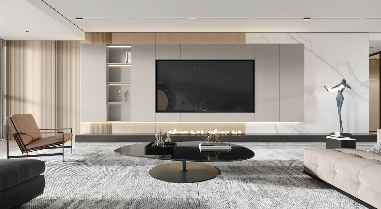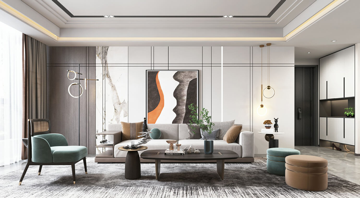 現(xiàn)代輕奢風(fēng)格的特點(diǎn)之一是注重材質(zhì)的選擇和質(zhì)感的呈現(xiàn)。在空間設(shè)計中,通常使用大面積的高檔材質(zhì),如天然大理石、優(yōu)質(zhì)實木、高級石材等,這些材質(zhì)可以為空間營造出一種高貴、奢華的感覺。
