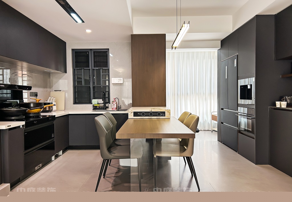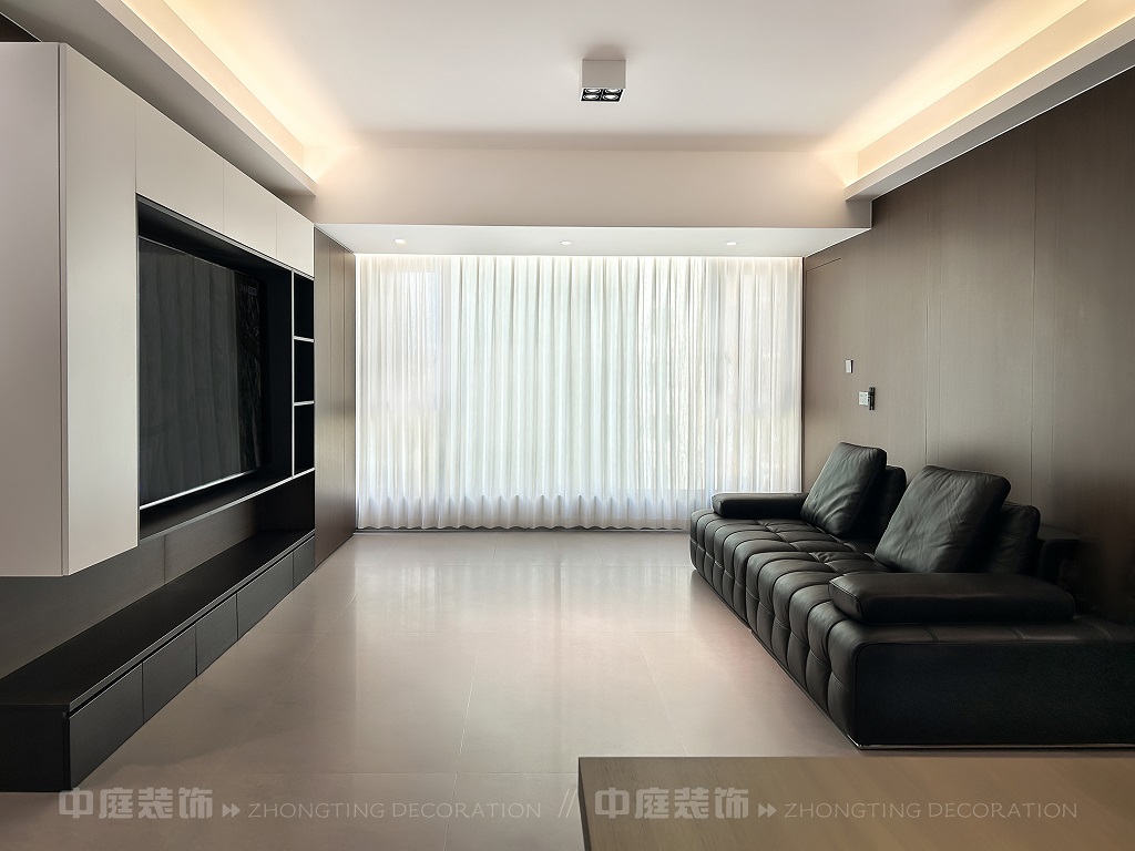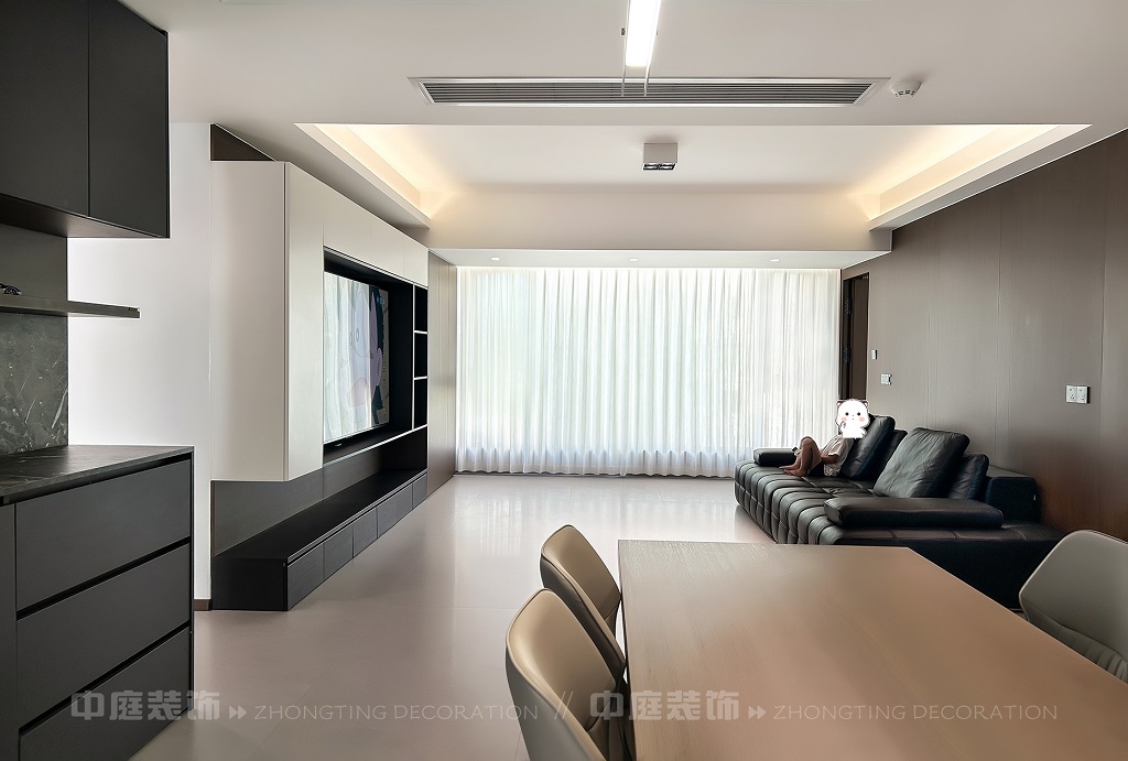客廳以現(xiàn)代黑白灰極簡(jiǎn)風(fēng)格為核心,大面積白紗簾引入自然光線,黑色皮質(zhì)沙發(fā)質(zhì)感高級(jí)。開(kāi)放式布局,深灰櫥柜與木質(zhì)餐桌形成材質(zhì)對(duì)比,線性吊燈提升精致感,功能與美學(xué)兼具,營(yíng)造現(xiàn)代簡(jiǎn)約的烹飪用餐氛圍。輕柔窗簾與柔和燈光,打造靜謐休息空間。精致的材質(zhì)選擇與合理的功能規(guī)劃,詮釋了“少即是多”的現(xiàn)代簡(jiǎn)約居住美學(xué)。